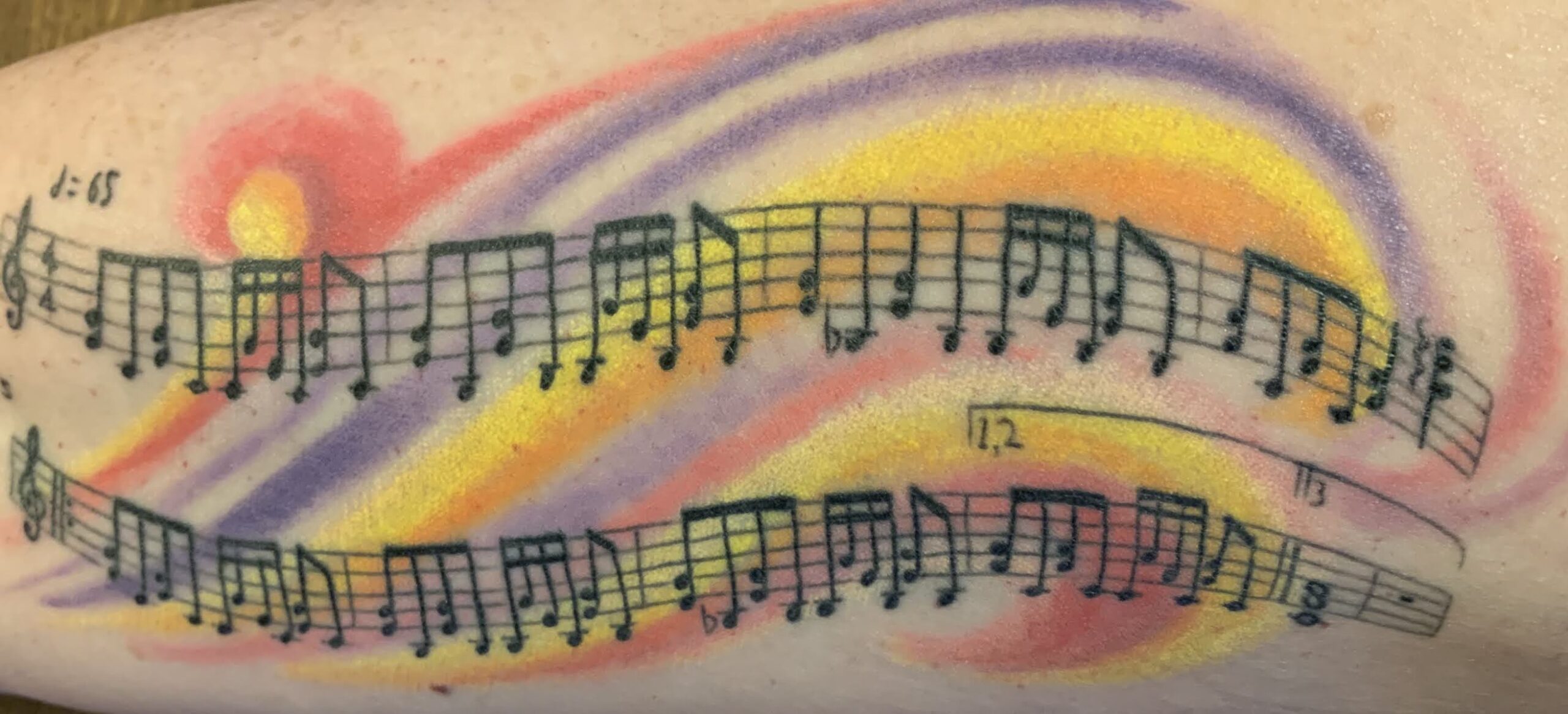My tattoo artist up here is AMAZING! Now, you may ask, "Why the music?" I am a music junkie. I'm a musician. I can't live my life without music. So the left arm is a nod to how much music means to me. The right arm? Well, this happens to be the beginning sheet music to my most favorite song to play on the piano. Yes, I put a Motley Crue song on my arm. Sue me, but Home Sweet Home is my go-to when I find time to sit down and tickle the ivories.